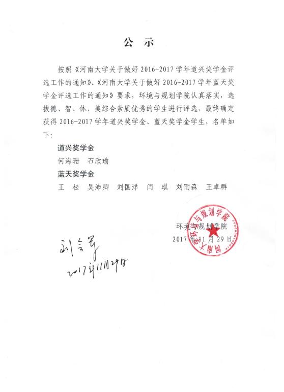 【公 示】2016-2017学年道兴奖学金、蓝天奖学金评选结果