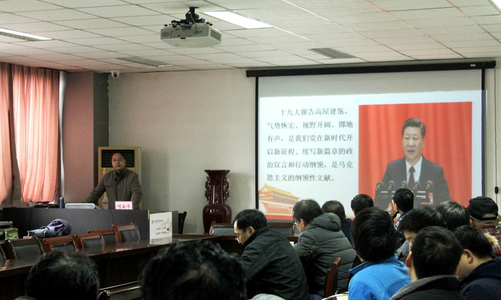 何云峰教授从“十九大的主题”“过去五年的历史性成就和历史性变革”“中国特色社会主义进入新时代”“新时代中国共产党的新使命”“重大战略部署”及“十九大对党章的重大修改”等十个方面对十九大报告内容进行了深入浅出的解读。他的解读逻辑框架清晰,论述旁征博引,语言生动幽默,为全院教职工带来了一场十九大报告解读的精神盛宴。之后,结合学校实际,何云峰教授又深入解读了卢克平书记、宋纯鹏校长在庆祝建校105周年暨学科建设工作会上的讲话精神,介绍了学校近期工作“一条主线,两项工程,三项基础保证”的工作思路。他鼓励在场教职工要在党的十九大精神引领下不忘初心,牢记使命,努力奋斗,争取在建设“双一流”大学的新征程中取得优异的成绩,迎来河南大学更加灿烂的明天。